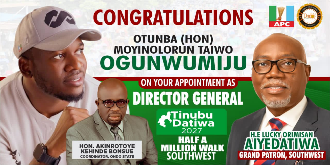 Akinrotoye, in a statement signed and made available to newsmen in Akure by his media aide, Adeseun Adetayo, said members of the Tinubu/Datiwa Half a Million Walk extend their heartfelt congratulations to Ogunwumiju, who also serves as Parliamentary Secretary of the Ondo State House of Assembly, on his well-deserved appointment.
